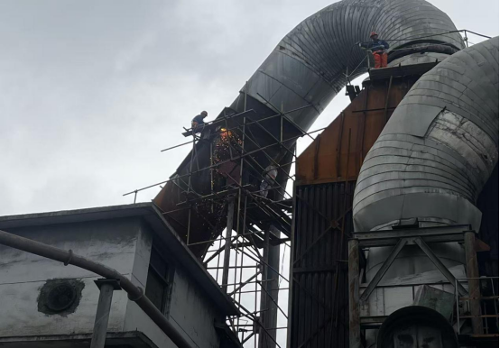 不远处,检修人员正在拆卸提升机料斗。他们熟练地操作着各种工具,小心翼翼地将料斗从提升机上拆卸下来。尽管已是金秋时节,他们的脸颊上仍渗出了汗珠。各种工具的敲击声、警示语音声以及指挥口哨声交织在一起,奏响了一曲独特的“检修交响曲”。身着蓝色的工装、头戴安全帽的职工们在庞大的设备间穿梭,他们的眼神中透露出专注与坚毅。