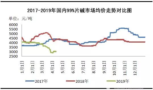 图1 2017-2019年国内99%片碱市场均价走势对比