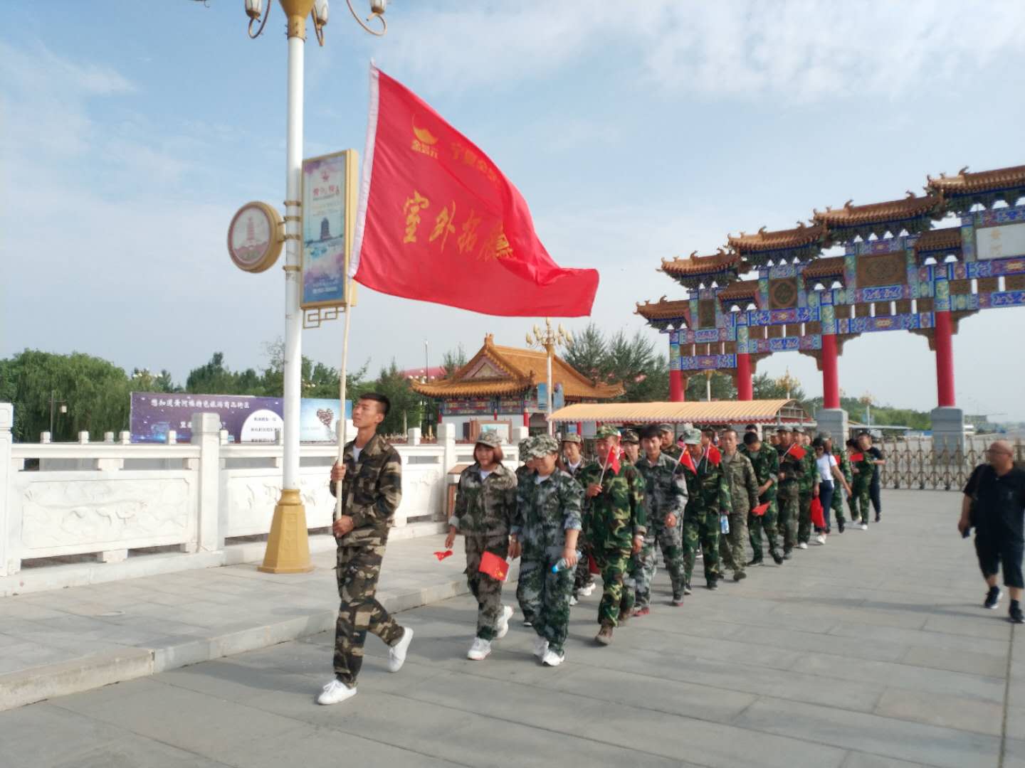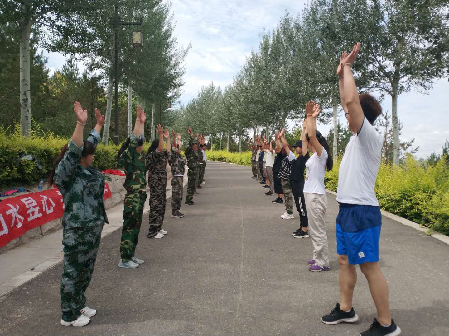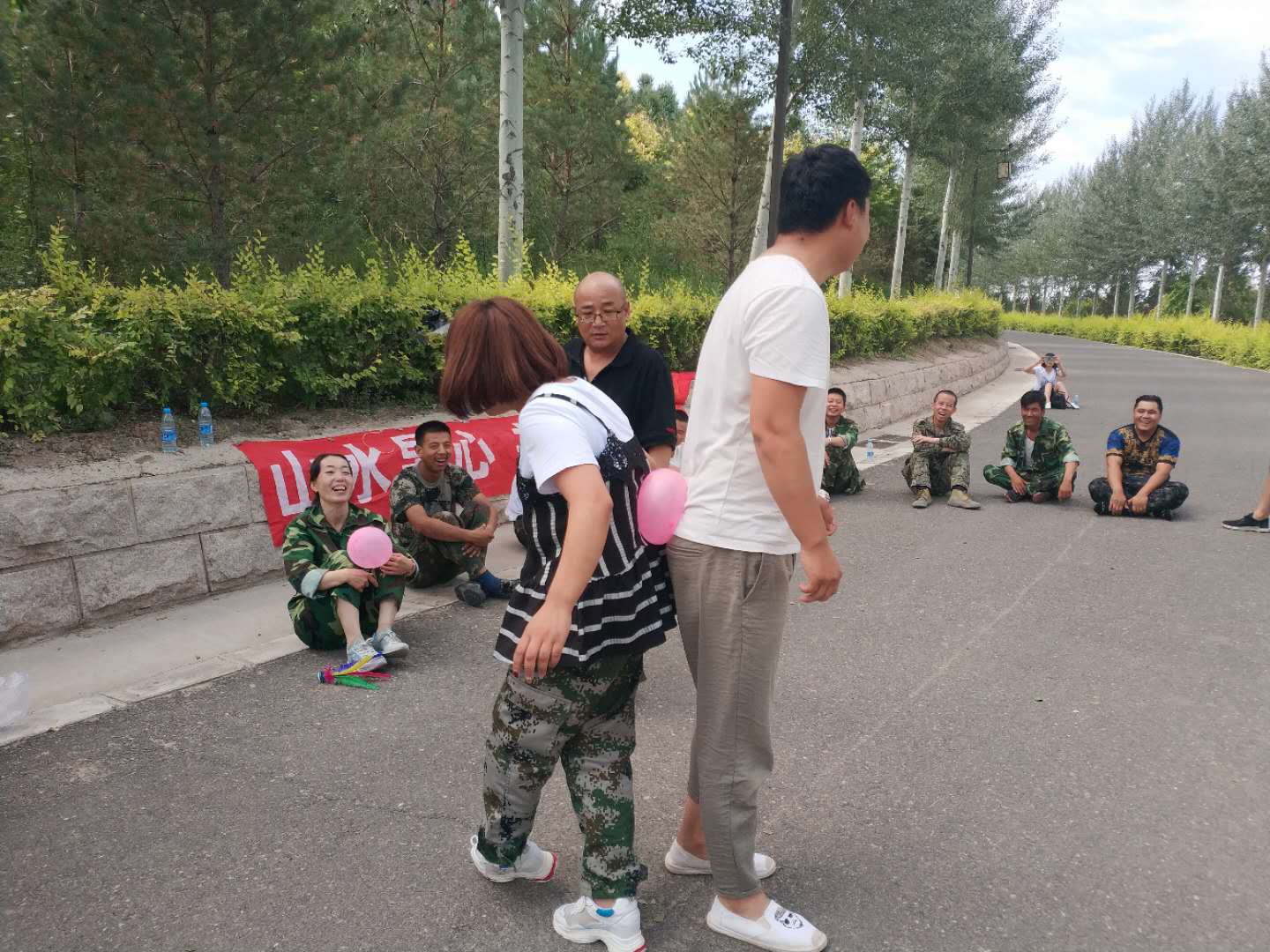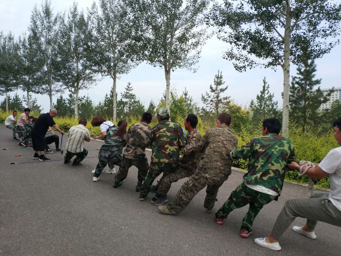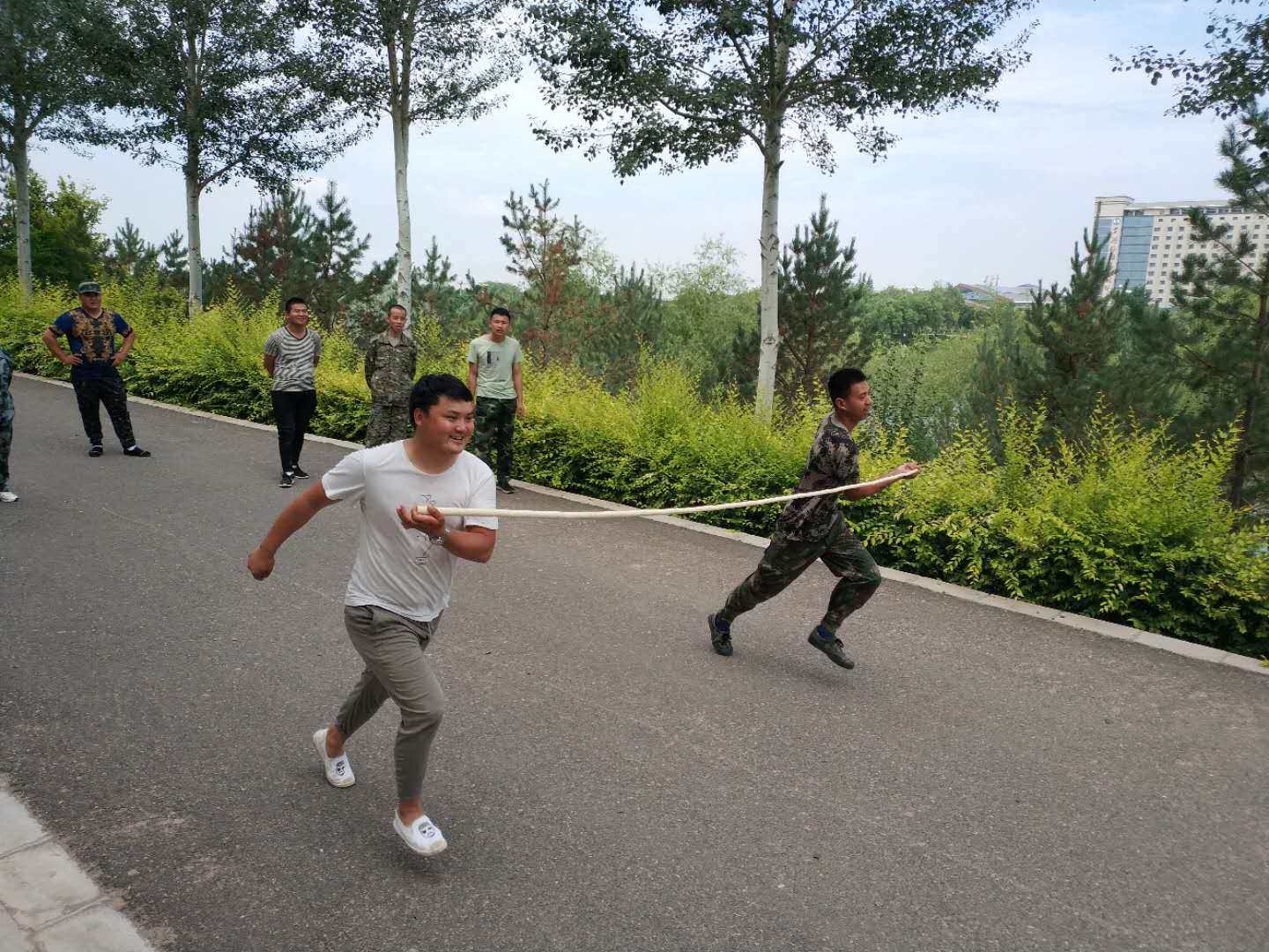 早上8点到黄河楼后,我们对18名新学员进行了分组,将队员分成两支队伍,由队长组织进行游戏。在队长的带领下,各队队员精诚合作,相互支持,先后进行了“跳绳比赛”、“个人跳绳比赛”、“斗牛比赛”“背对背运气球比赛”“拔河比赛”、“俯卧撑比赛”等拓展项目。