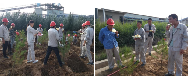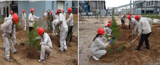 劳动过程中,领导处处带头,员工们热情高涨,选树苗、挖树坑、填底土、种树、浇水、修剪树枝,干劲十足,整个厂区变得热闹起来。