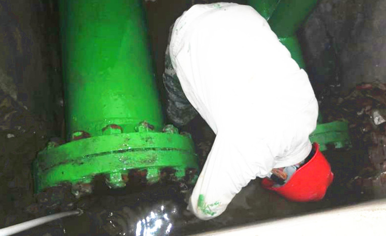 原卤管线是采卤岗位重要的组成部分,是停车必检项之一。但是检修难度不小,一是过道空间狭小,光线昏暗,一次仅够两个人同时作业;二是检修原卤管线时,必须“涉水”作业。检修期间原卤管线一闪一闪的焊光将周围照亮,顺着火花向里看去,只见有两个人在狭小的空间绻着身子低头忙活着,感觉身子都转不开的样子。他们像小猫似的蜷缩在两边,全身湿透,白色的工服也被锈渍染的乱起八糟,被油渍沁透成一坨一坨的,但他们坚定的眼神、专注的神情却叫人佩服。我不禁问道:“这么窄的空间人咋进去啊?”他们开玩笑的说:“用缩骨功啊!”