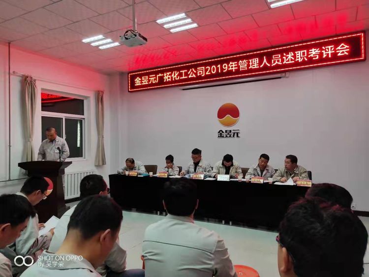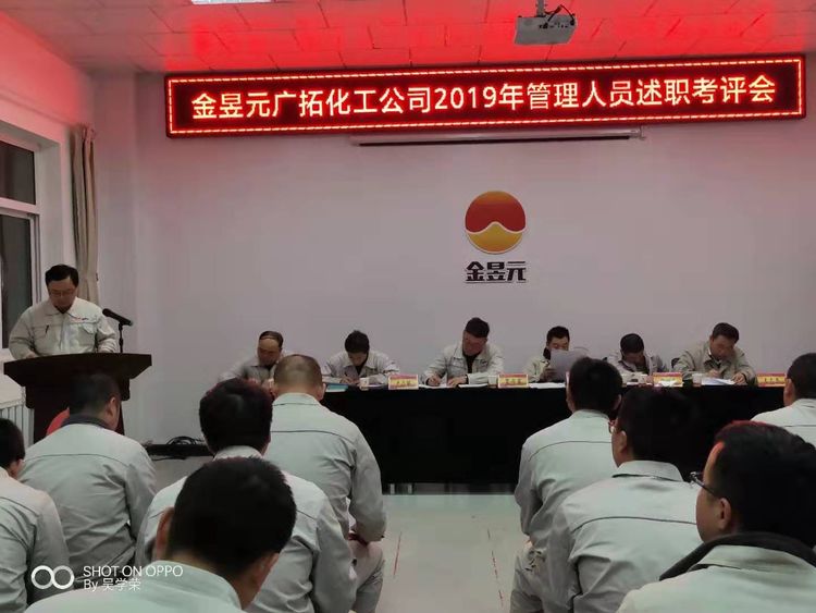 2019年11月19日—20日,广拓化工公司利用下班时间组织召开了2019年度管理人员述职考评会,会议由兴昊党支部副书记王志杰主持,化工公司总经理,副总经理,安全总监,副总工程师出席,32名述职人员及110名职工代表参加。