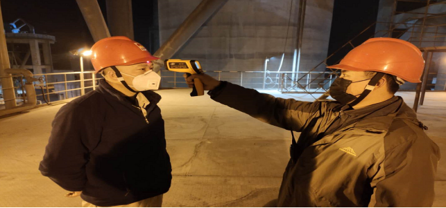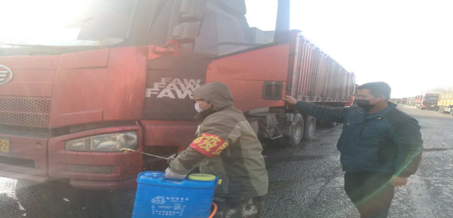 在园区南门,今日截止下午17时整,他们检测、消毒、登记车辆92辆(其中水泥19车辆,熟料9车辆,2辆氧气配送车),人员98人信息,体温均在正常范围,另外随行26人体温均在正常范围。