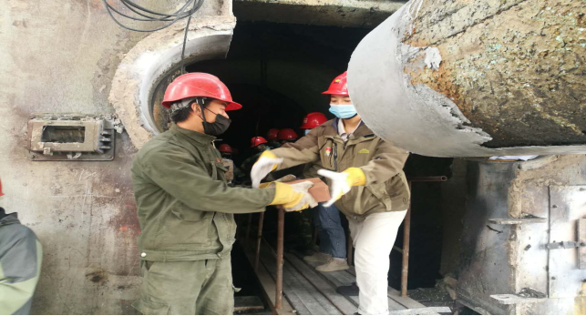 在回转窑挖补窑砖现场,他们手传手,开展接力,窑砖补填……