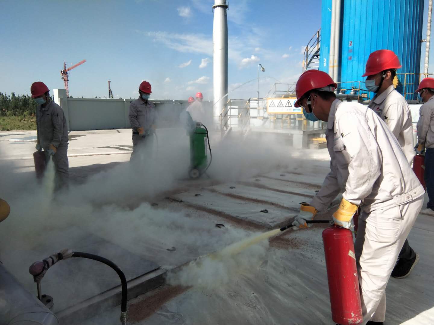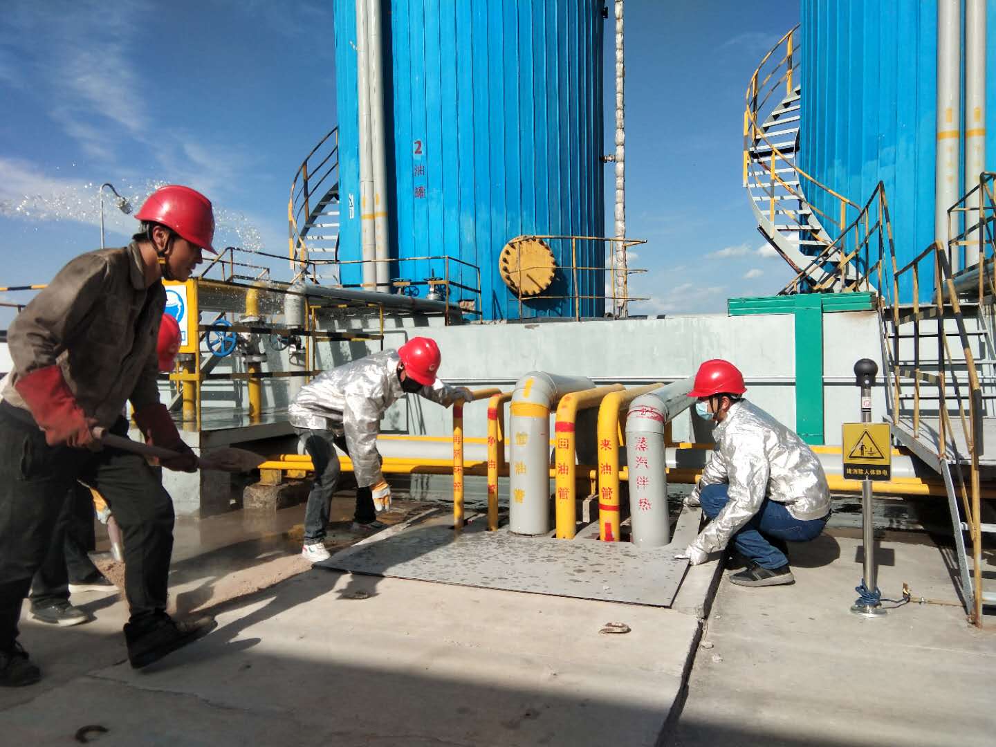 演练以维修工在焊接护栏时将焊渣掉入燃油库房导流沟引起沟内棉纱着火事故为主题,当班调度接到岗位人员汇报后组织义务消防员对油罐、回油、来油、再循环管道进行降温,并汇报公司启动应急处置预案进行灭火的事故处置演练过程。