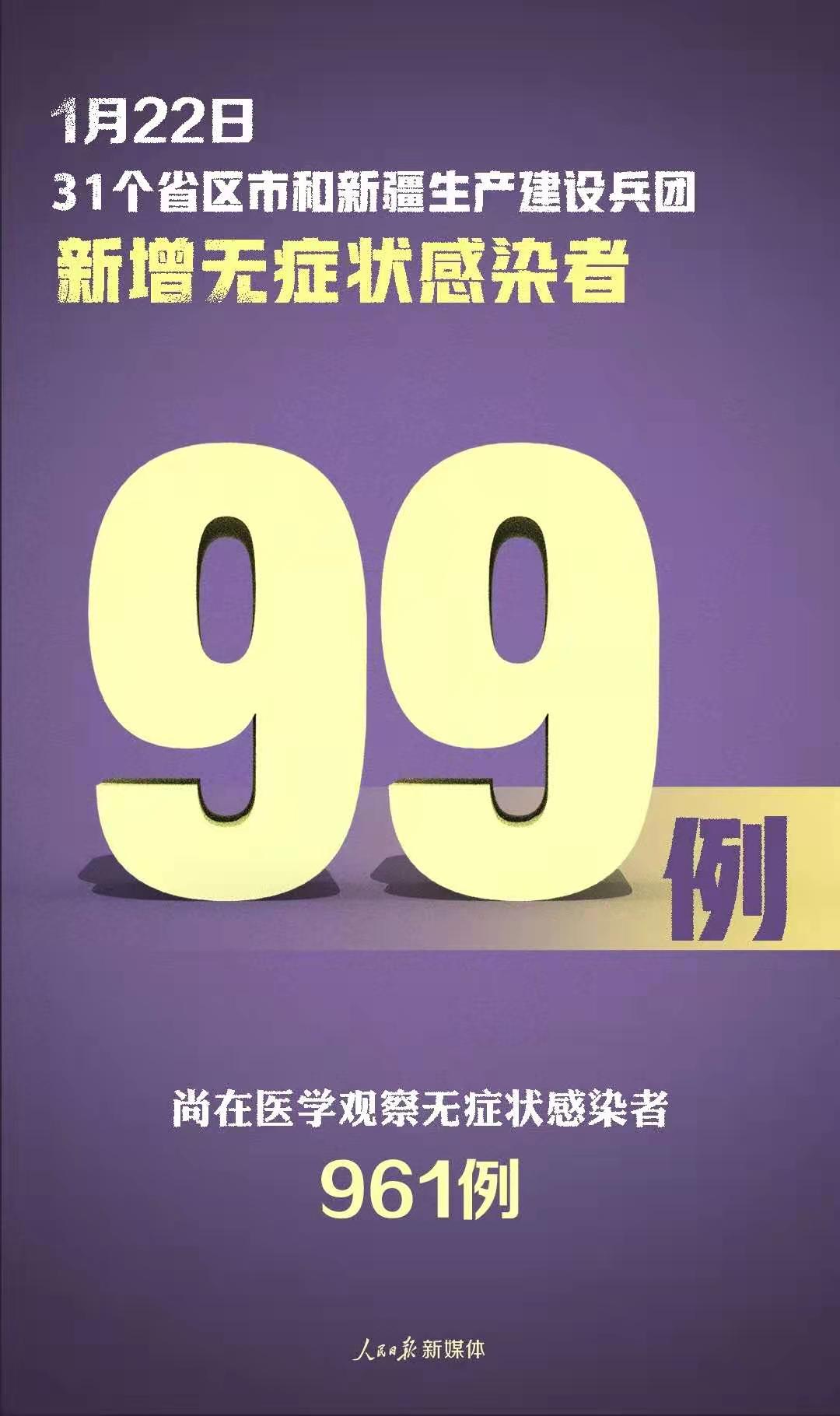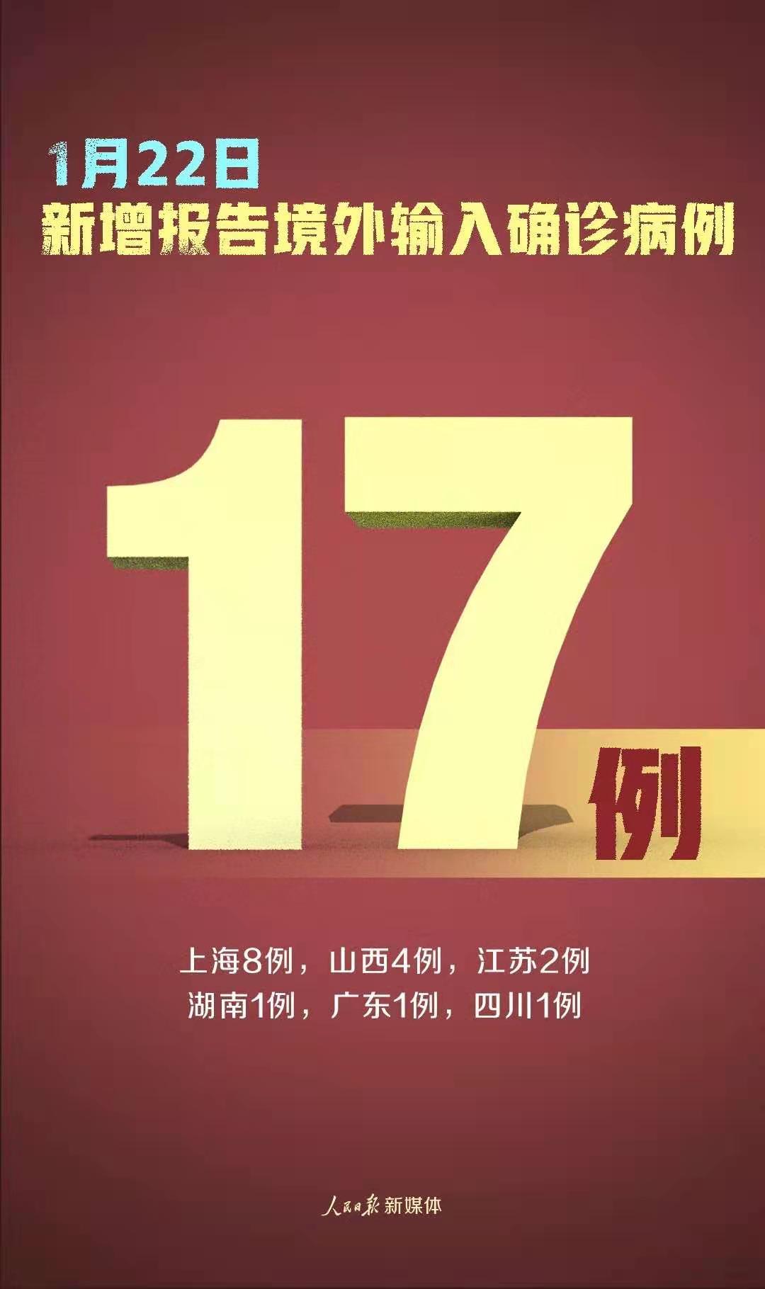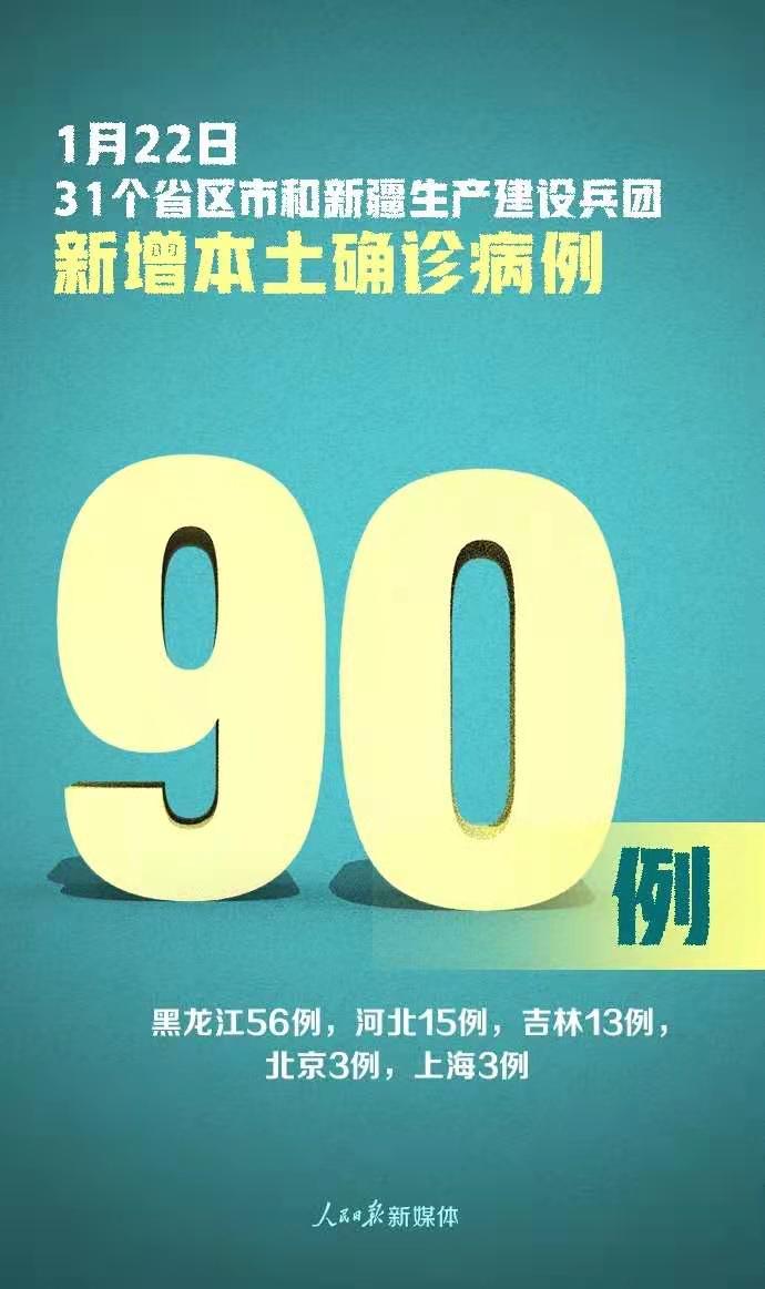1月22日0—24时,31个省(自治区、直辖市)和新疆生产建设兵团报告新增确诊病例107例,其中境外输入病例17例(上海8例,山西4例,江苏2例,湖南1例,广东1例,四川1例),本土病例90例(黑龙江56例,河北15例,吉林13例,北京3例,上海3例);无新增死亡病例;新增疑似病例2例,其中境外输入病例1例(在上海),本土病例1例(在上海)。