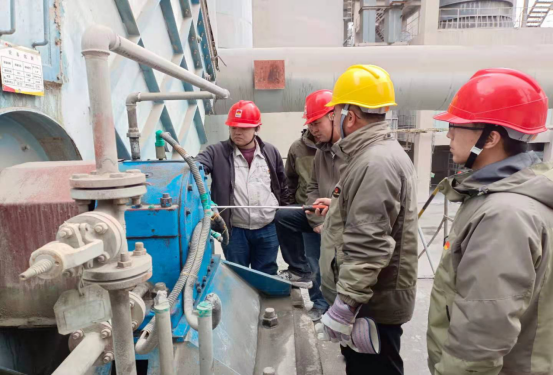 4月13日凌晨6时许,发现高温风机横向振动大,造成严重的安全生产隐患,为窑系统提产、提质造成障碍!为此,以坚持实干为导向,明确责任、担当作为、加压奋进,管理人员召开总体分析会,细化任务,合理安排人员互相配合,抢时间,抓进度,确保隐患尽快消除。