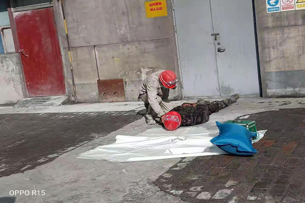 金昱元资源再生公司“心肺复苏进企业精准健康工程”我们在行动!为提高企业员工急救技能和培养健康素养,由安环科,总调度,分管水泥系统调度,装置进行事故演练〔心肺复苏——触电事故〕用实践与理论相结合的方式对员工进行普及,让员工掌握,遇到紧急情况时的处置能力,能够为抢救生命争取时间!实施科学的救助方法。