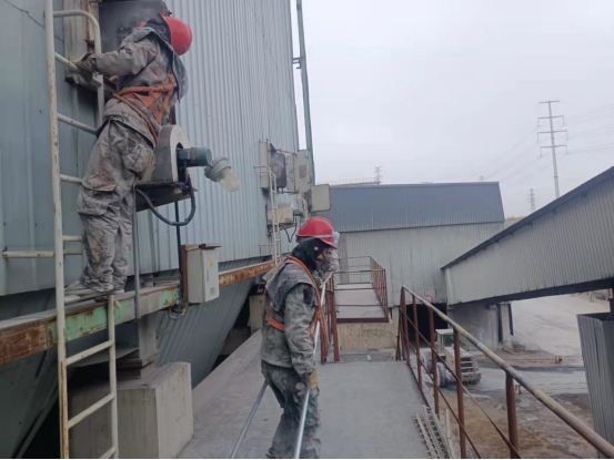 电收尘设备检修现场,由于电收尘内部极丝断裂和灰斗积灰严重,导致电收尘各电场无电压电流显示。11月4日19时30分,回转窑系统止料,计划停车24小时,检修窑尾电收尘器。除尘器检修都是内部操作,空间狭小,且都存在技术性,人员只能分头进行,轮流进行更换极丝和清除积灰,用扳手、3米左右长的卸料竹竿敲打极丝,一道道工序,都存在着一定的难度,一方面靠着臂力、靠着准心,另一方面就是人工完成拆卸更换极丝,清除灰斗积灰,靠的时耐心和责任。通过检査最终整修完成了更换11根极丝,清理了20个灰斗,圆满完成此项电收尘器检修任务。