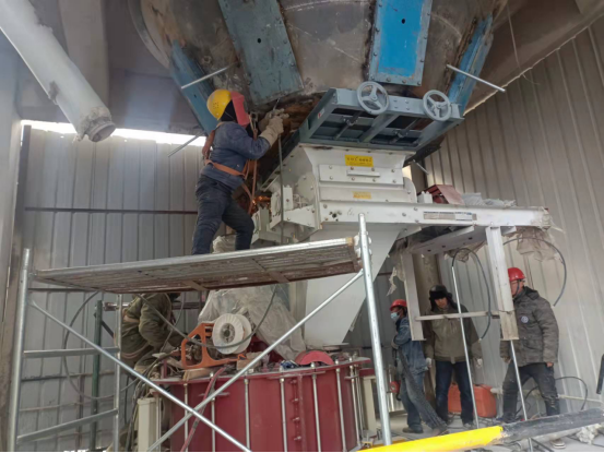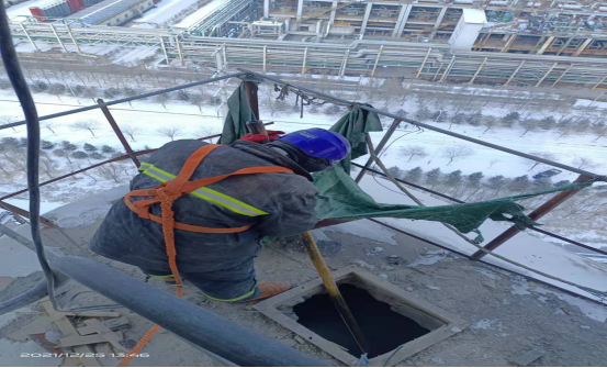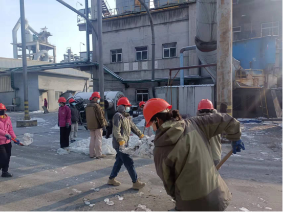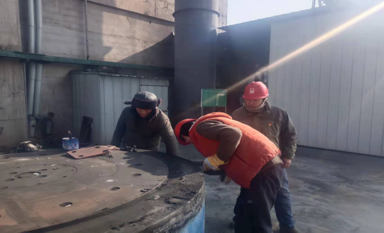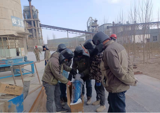 检修人员钻进预热器检查门子是检修预热器管道的“必经之路”,也是支撑彻底完成预热器检修的关键环节。因为时间紧、任务重,为了不影响检修进度,检修人员常常进去干干净净,出来时灰土灰脸,不得不轮番上阵,从上到下,完成结皮清理。他们四人一组,从安全监护到技术指导,干一干,歇一歇,接着再继续……即便是当前零下十几度,也能干出一身汗,喝口水的功夫,渗出的汗液就能结成冰。