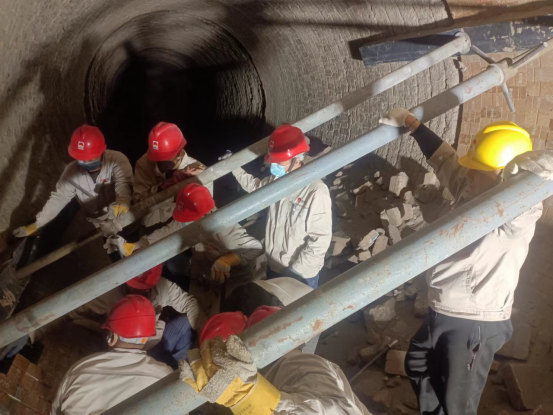 4月8日8:30—23:00分,在一片紧张有序的指挥中,展开了争分夺秒的窑砖挖补工作。这里有公司领导、职能科室、质检科及生产装置全体员工。在现场,他们齐心协力、同舟共济、相互打压加气,每一块砖凝结着每一位员工心血。直至深夜,每个人坚持工作的最后一刻,从他们的表情中,可以看出,那种屏住呼吸、动作标准、目光坚定,无不诠释着对工作的履职尽责。