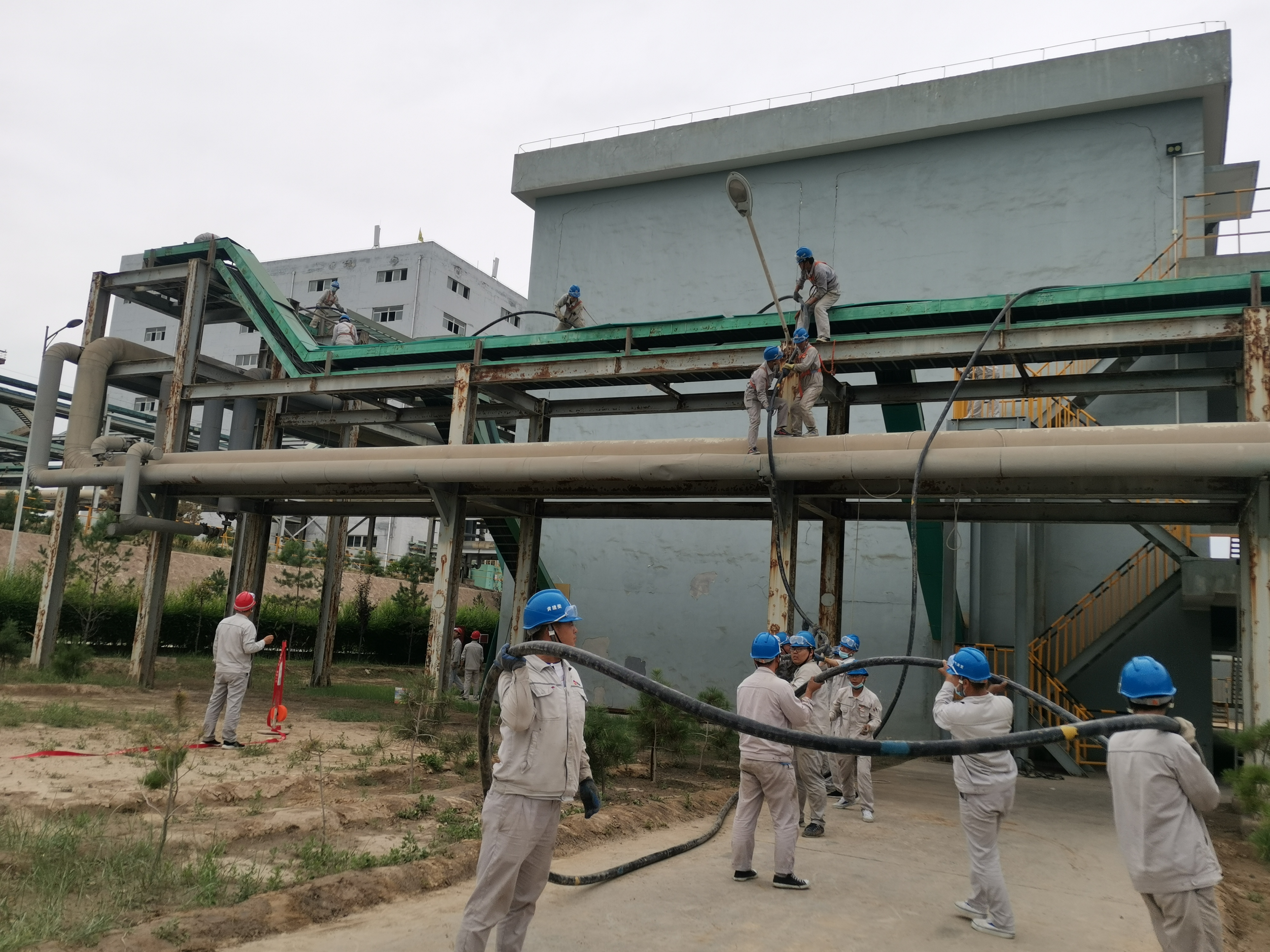 高温天气,尤其到了下午两三点,太阳像火炉一样烧到正旺的时候,大家暴露在烈阳下,这个时候最容易中暑,提醒作业人员及时补充水分,轮换休息,保证体力跟得上工作节奏。因为先要拆除掉锈蚀掉的桥架,锯弓锯,撬杠敲打,用绳子拽,还要注意桥架的随时掉落,高空作业精神紧绷,每个人都是汗流浃背。腐蚀掉的桥架拆除后,新的桥架不断调整安装位置,再用螺丝紧固,就这样,电缆桥架被一节节拆除又被一节节安装上,他们头顶的蓝色安全帽在阳光下来回移动着,就像一串跳跃着的蓝色音符。