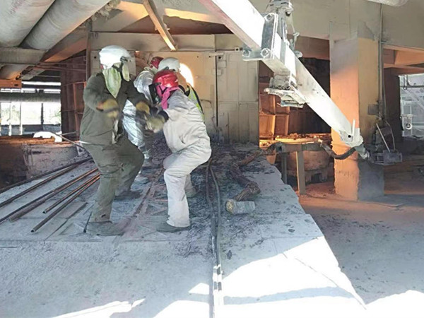无论是严冬还是酷暑,走进资源再生电石出炉现场,就能看见这么一群“全副武装”的职工,身着隔热服,头裹防高温面罩,手戴着“手焖子”,脚着厚劳保;他们同心协力,干劲十足得挥舞着手中的钢钎,钢钎在炉眼里来回穿梭,将近2000摄氏度高温的电石缓缓流入电石锅,这一群人就是电石生产中最可亲可爱的“出炉工”。