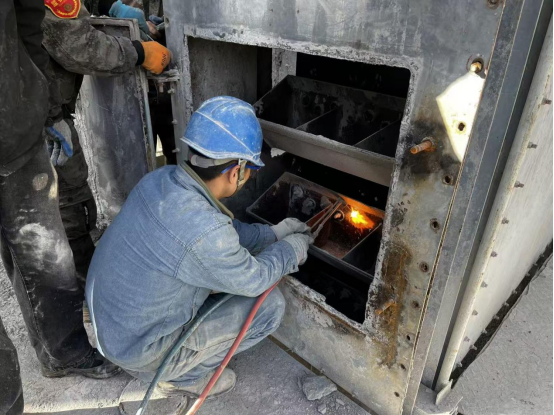 不远处,检修人员正在拆卸提升机料斗。他们熟练地操作着各种工具,小心翼翼地将料斗从提升机上拆卸下来。尽管已是金秋时节,他们的脸颊上仍渗出了汗珠。各种工具的敲击声、警示语音声以及指挥口哨声交织在一起,奏响了一曲独特的“检修交响曲”。身着蓝色的工装、头戴安全帽的职工们在庞大的设备间穿梭,他们的眼神中透露出专注与坚毅。