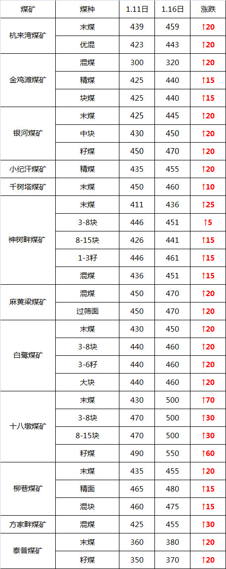 据榆林煤炭交易中心数据统计,与1月11日相比,目前榆林的在产煤矿价格涨幅最高达到了70元/吨。