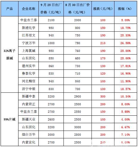 进入9月,国内烧碱市场终于打破7月以来的平衡状态,价格出现迅猛上涨走势。截至9月25日,山东地区32%离子膜碱市场均价上涨135元/吨至800元/吨,涨幅为20.3%,内蒙地区99%片碱上涨200元至2650元/吨,涨幅为8.16%。相比而言,片碱市场表现相对温和,液碱市场则更显迅猛。