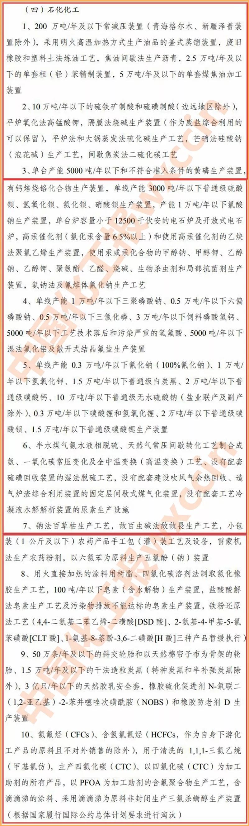 石化化工行业淘汰类有10大类,比征求意见稿少了2大类,包括:200 万吨/年及以下常减压装置,2.5 万吨/年及以下的单套粗(轻)苯精制装置,5 万吨/年及以下的单套煤焦油加工装置;单台产能 5000 吨/年以下黄磷生产装置;半水煤气氨水液相脱硫、天然气常压间歇转化工艺制合成氨、一氧化碳常压变化及全中温变换(高温变换)工艺、没有配套硫磺回收装置的湿法脱硫工艺,没有配套建设吹风气余热回收、造气炉渣综合利用装置的固定层间歇式煤气化装置,没有配套工艺冷凝液水解解析装置的尿素生产设施;钠法百草枯生产工艺,敌百虫碱法敌敌畏生产工艺,雷蒙机法生产农药粉剂,以六氯苯为原料生产五氯酚(钠)装置等。