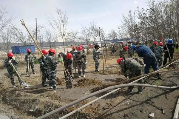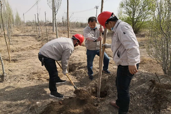 参加植树的职工一到植树现场,便投入到忙碌的工作当中,大家争先恐后挥锹挖土、放苗回填,现场一片繁忙景象。