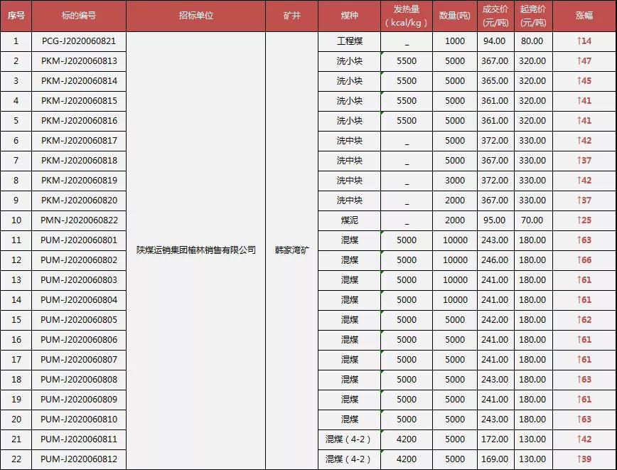 昨日,榆林地区陕煤旗下六大煤矿最新竞价结果公布,成交价最高涨幅达到32元/吨。