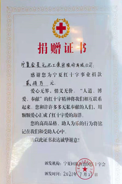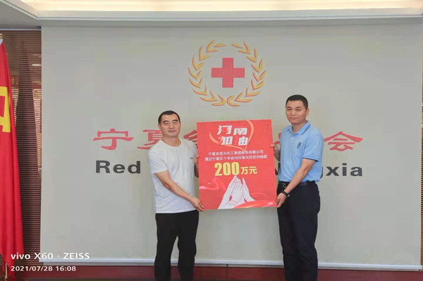 洪灾无情,人间有爱。7月28日,宁夏金昱元化工集团股份有限公司委托宁夏红十字会向河南灾区捐助二百万元,驰援河南受灾地区,表达对灾区人民的深切问候。